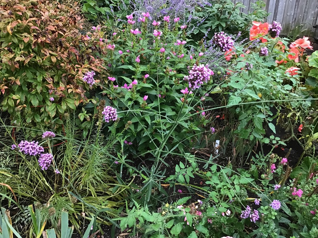 This plant is one of about 250 species in the genus Verbena. Most are not in cultivation.  It is native to Brazil and Argentina.  Bonariensis means ‘from Buenos Aires, Argentina’.  ‘Buenos’ means ‘good’ and ‘aires’ means ‘air’. It is a perennial in zones 7 to 11, therefore, is grown as an annual in the Peterborough region.  In some milder climates such as California, it can be considered a weed. Verbena bonariensis, also known as Tall Verbena or Brazilian Verbena has stiff upright branching stems.  It reaches a height of 3 to 6 feet and spreads 1 to 3 feet and is unlikely to fall over.  The stiff square and rough stems hold clusters of lilac-purple flowers from early summer right through to late fall.  The deep green, lance-shaped serrated leaves form a mounded rosette at the base of the plant.  The flowers are borne in rounded clusters 2 to 3 inches across.  The cut flowers last a long time in flower arrangements.  England’s Royal Horticultural Society Floral Committee awarded V. bonariensis an Award of Garden Merit (the Society’s symbol of excellence given to plants of outstanding garden value) “because of its attractive flowers and uncluttered habit.” They can make an unforgettable display and although they are tall plants, they have an open and airy appearance which lends them to being tucked in between other plants or even creating a dramatic appearance at the front of a border.  They sway in the breeze and are very attractive to butterflies, bees and other insects.  They prefer full sun to part shade in well-drained soil.