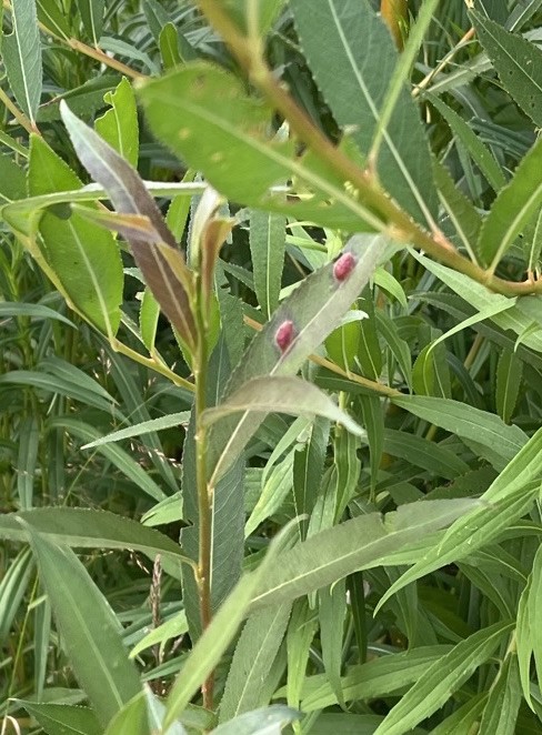 Euura proxima (Willow Redgall Sawfly) frequents certain Salix spp. (Willow). This gall can be identified by its red bean-like appearance on the leaves. Sawfly larvae are often mistaken for Butterfly or Moth caterpillars. They can be distinguished by the number of abdominal prolegs: the former has six or more and the latter five or less.