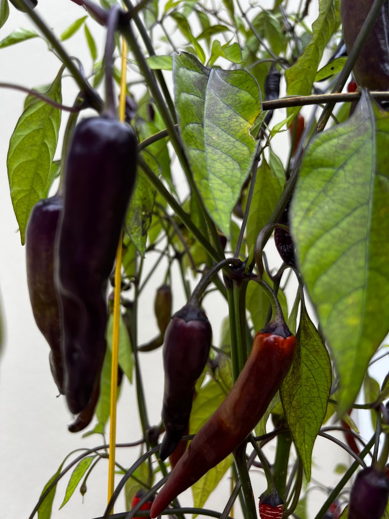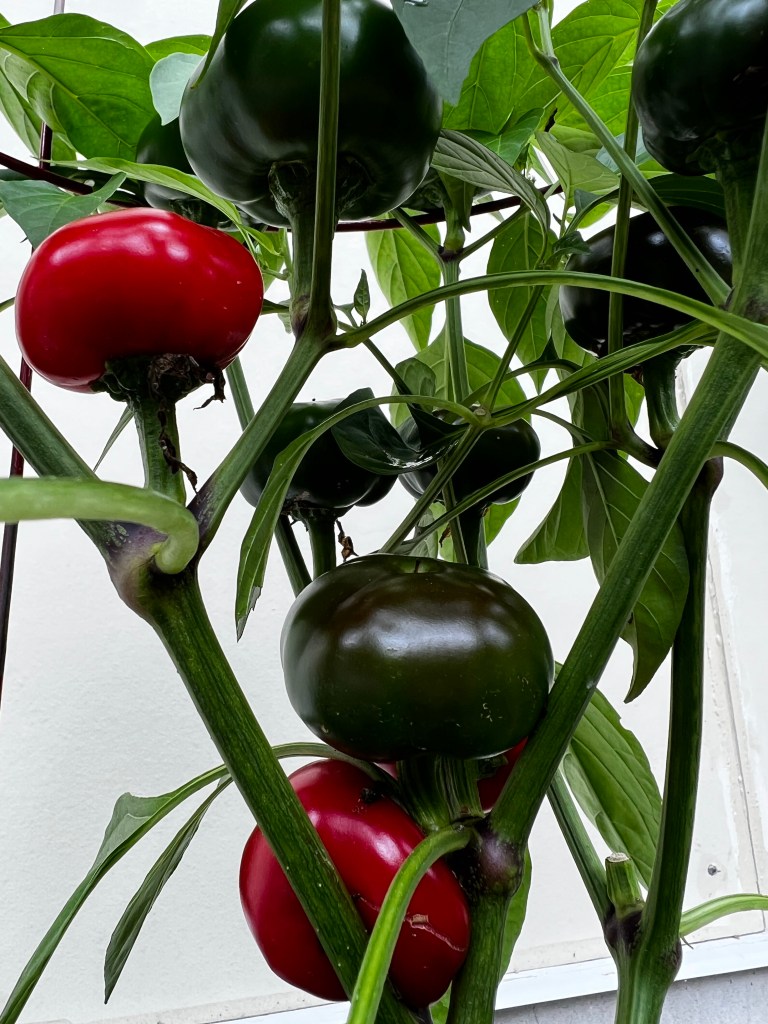 - Two different peppers that I grew as container plants: (i) Mini Red Bell that produced early sweet peppers that are 1-1/2 inches tall and wide and (ii) Buena Mulata a hot cayenne variety that changes from a pretty purple to red when ripe although we also enjoyed the early milder purple peppers in fresh salsas. Both pepper varieties are very productive, yielding dozens of peppers on one plant!