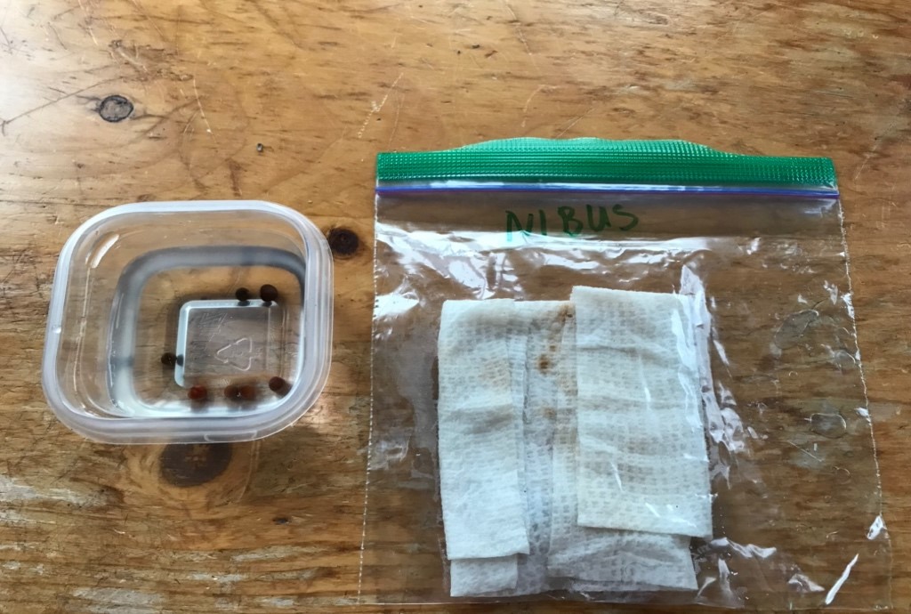 Seeds soaking (left) and seeds being presprouted in paper towel; Presprouted seed (right)