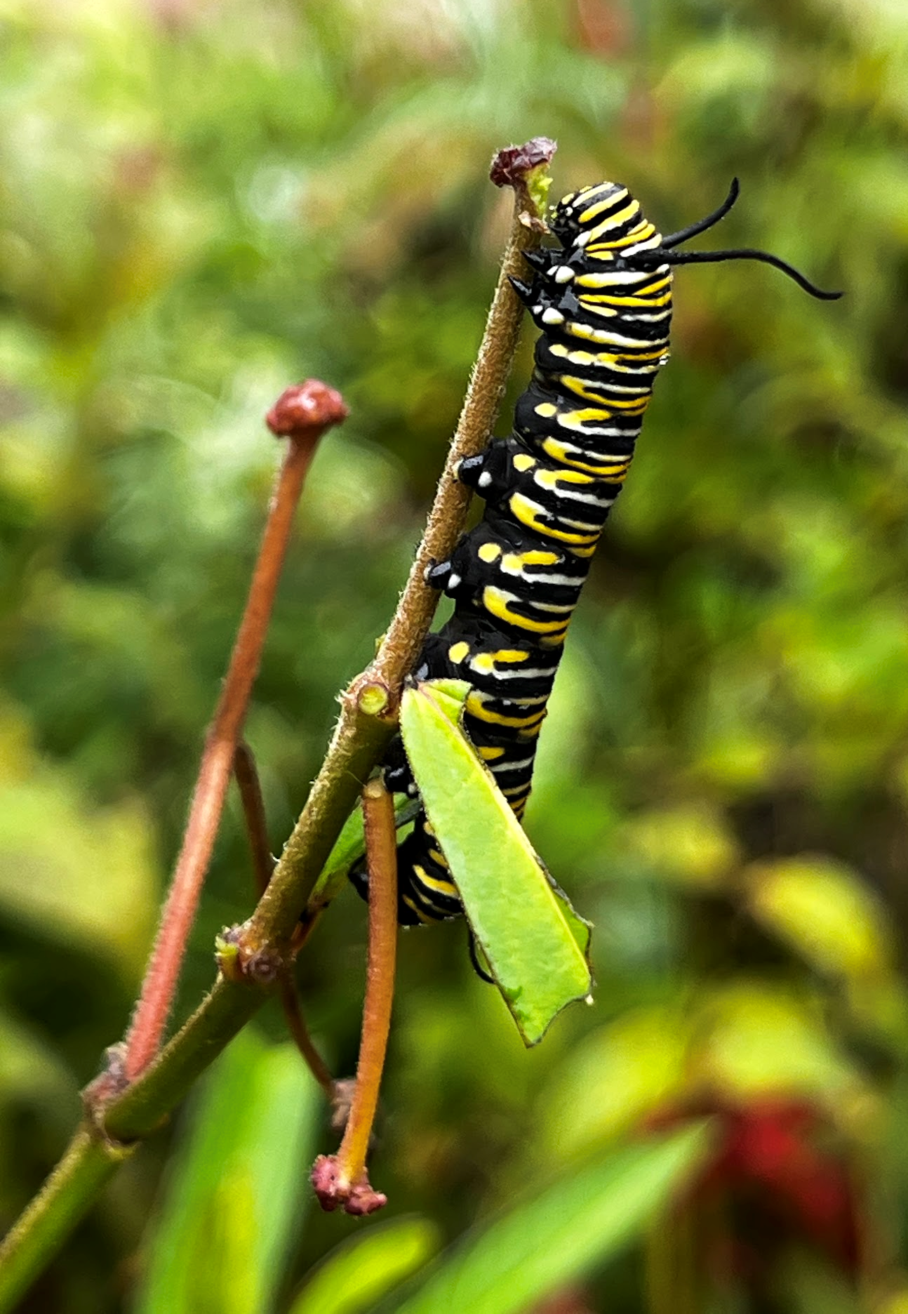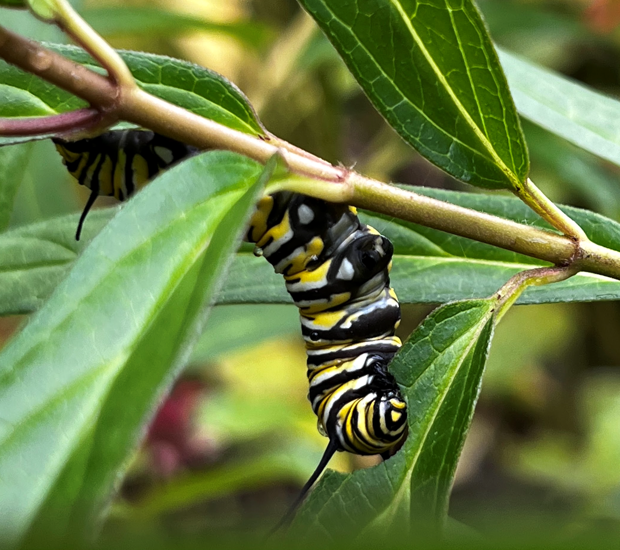 My 2023 garden gave me a front row seat for observing the monarch butterfly (Danaus plexippus) lifecycle. Two monarch caterpillars fed on my garden’s swamp milkweed (Asclepias incarnata) lower leaves for about 10-12 days. I was very concerned when one started a long journey across the 10-foot-long patio and then climbed 10 feet up the house wall to make its chrysalis just under the eaves! I was relieved to read that monarch caterpillars typically do leave their host plant to make their chrysalis elsewhere just in case there are younger caterpillar instars feeding on the same plant. It would be tragic if their chrysalis came crashing down as another caterpillar feeds on the leaf from which it is suspended!