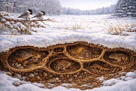As snow ages, it settles and compresses into denser layers. Below these compressed layers is a gap between the snow and soil, the subnivean zone—a hidden world of tunnels for voles, mice, shrews, and overwintering insects. Stable snow layers mean stable winter habitat for these creatures which directly influences survival migrating birds and awakening mammals (Pauli et al., 2021).