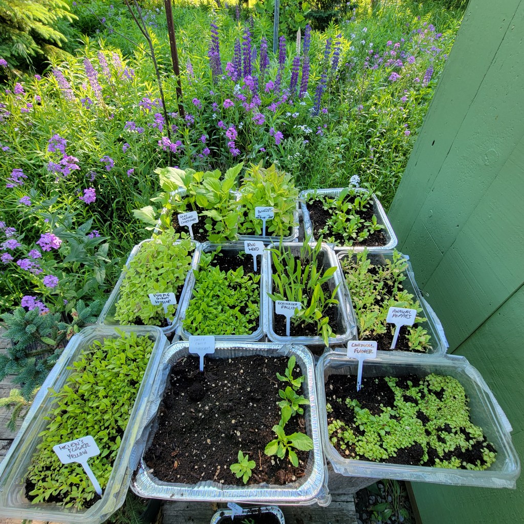 Most winter sowers tend to use milk jugs for their seeds, but these are not readily available in Ontario – we still love our milk bags! But the reality is that you can use any container for winter sowing as long as it can hold at least 3 inches (7.6 cm) of potting soil. I have seen various other things used – juice bottles, clear pop bottles, blue and green bottles, aluminum pans, salad boxes, plastic containers, pretzel barrels, cheese curl containers, ice cream buckets, nut containers, and vinegar jugs. They must be translucent (some light passes through) or transparent (all light passes through). Opaque materials will not work. Personally I have used the large fresh spinach containers or aluminum roasting pans with clear lids.