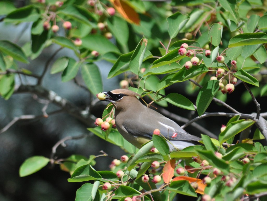 • Shrubs such as Grey Dogwood (Cornus racemosa), American Plum (Prunus americana), Chokeberry (Aronia melanocarpa) and the vine, Virginia Creeper (Parthenocissus quinquefolia) produce late-season berries that are rich in fats. Many insect-eating birds switch to eating berries in fall to store fat under their chests and wings to support either long journeys south or survival in our chilly winters. Berries of native shrubs have higher percentages of fat (6.5% to 48.7%) than most non-native shrubs (less than 1%) according to this study.