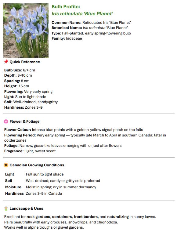 | Iris reticulata “Blue Planet” | 5 | $5 |