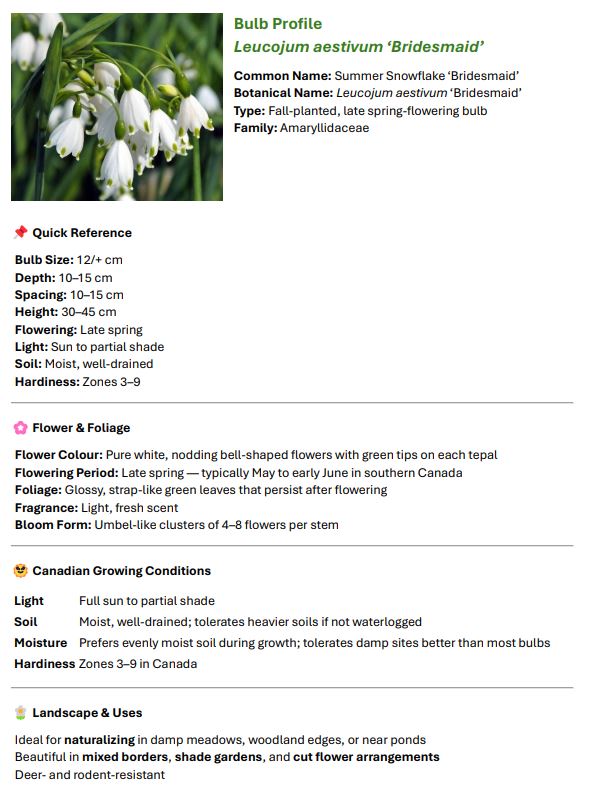| Leucojum/Summer Snowflake “Bridesmaid” | 5 | $15 |