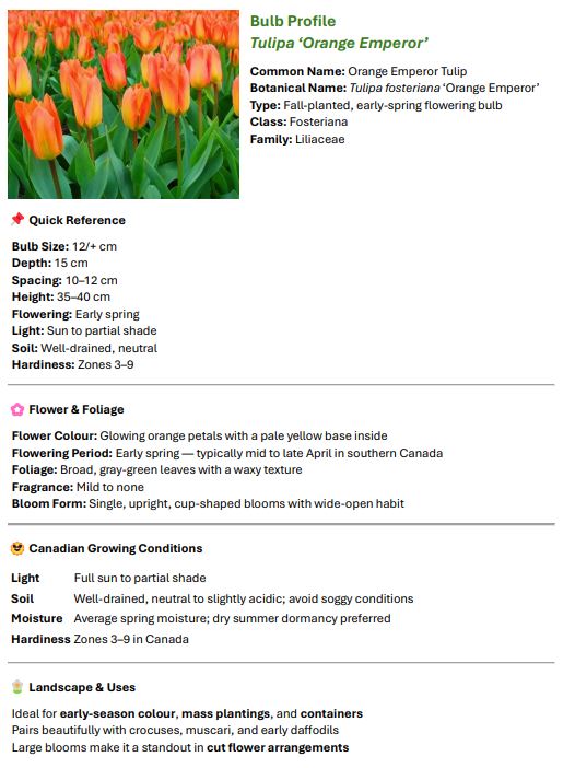 | Tulipa “Orange Emperor” | 5 | $15 |